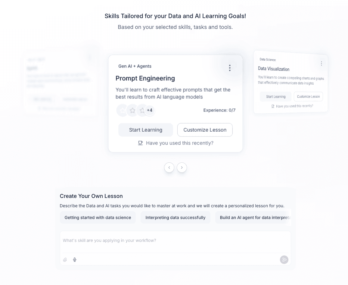 Early on, we optimized our curriculum curation heavily for flexibility. We recommended a few areas to start with based on who the learner is (their job, tools, tasks) and proposed initial lesson outlines for each area, but everything was in the control of the user. You could start anywhere. You could ignore the suggestions. You could create your own lesson on anything relevant to your work. This respected the learner’s agency, and it was our initial hypothesis of what a truly powerful AI-native learning engine could look like by putting full control in the hands of the users.
